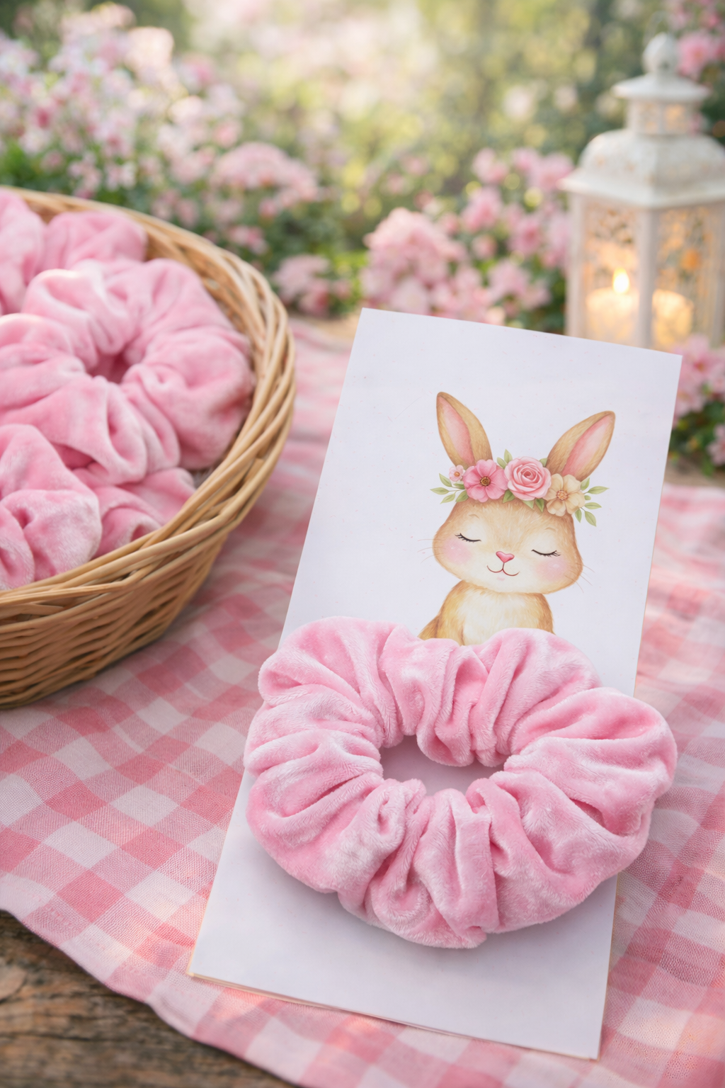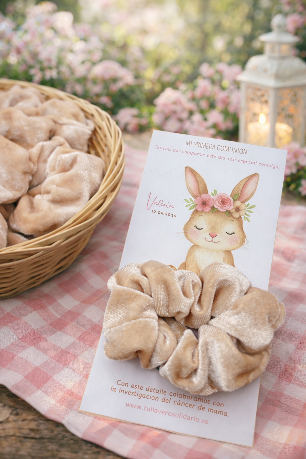 combinamos la corona de flores del conejito con el color del coletero en caso de azules o verdes